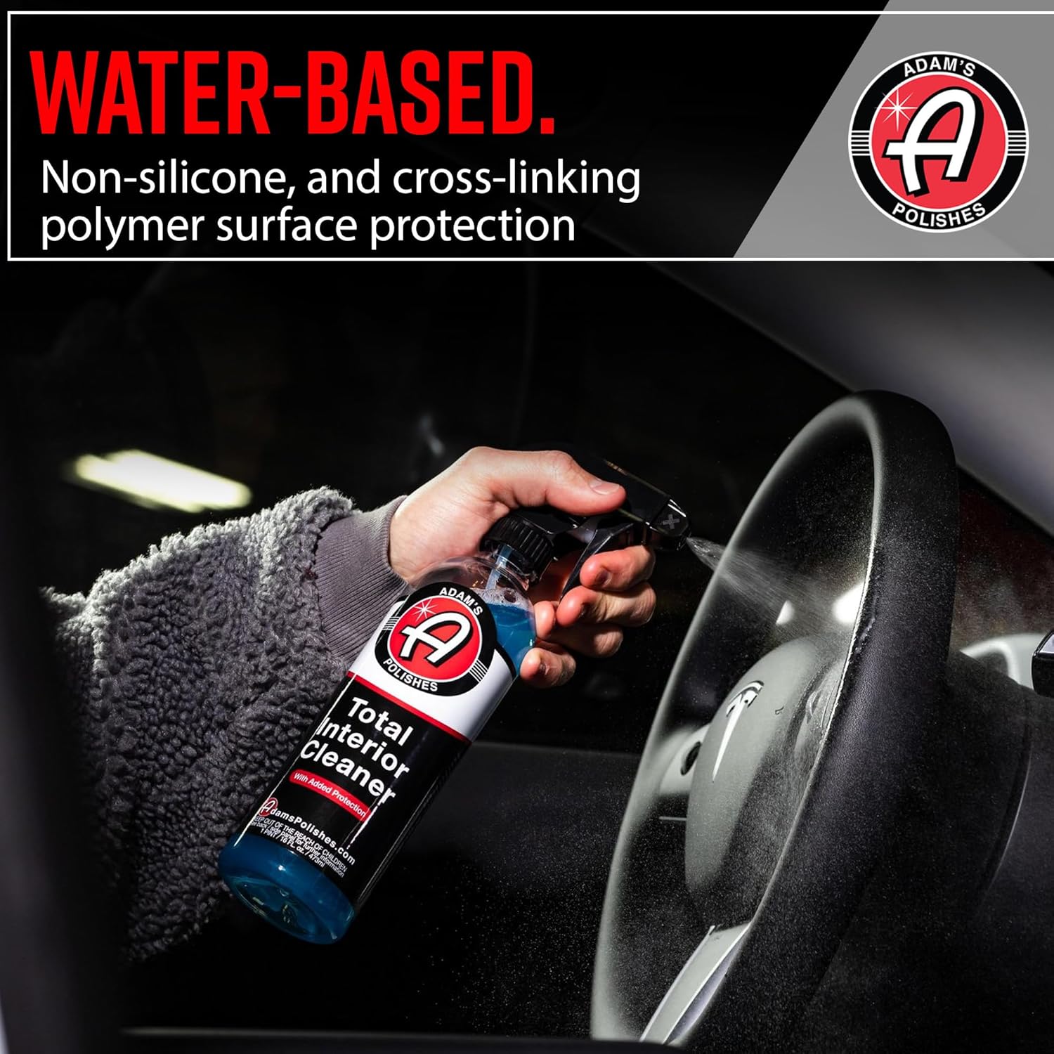 Adam’s Total Interior Cleaner does not contain any silicone or polymers that would leave the surface sticky, greasy, or glossy in appearance. Instead, the formulation contains a self-crosslinking polymer that actively cures into a protective coating on the surface to keep the surface cleaner, longer and less prone to dust build up, fingerprints and smudges. Additionally, this formulation has more powerful cleaning abilities than Adam’s Interior Detailer with Microban® and can even be used on textiles and fabric to power out stains, dirt, and grime.